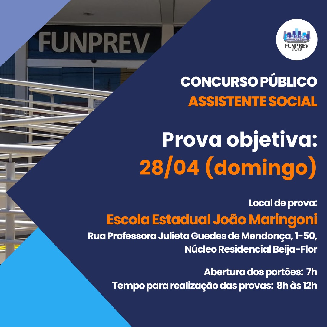 A Fundação de Previdência dos Servidores Públicos Municipais Efetivos de Bauru (Funprev) convoca os candidatos inscritos em concurso público de Assistente social para a prova objetiva, a ser realizada no próximo domingo, 28 de abril.