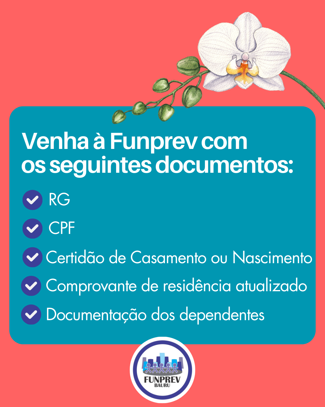 Em 2026, ano do Censo Previdenciário, os aposentados e pensionistas da Prefeitura de Bauru, Funprev, DAE ou Câmara Municipal devem, no mês do seu aniversário, comparecer à Funprev munidos de RG, CPF, Certidão de Nascimento (se for solteiro) ou de Casamento (com eventuais averbações), comprovante de residência atualizado e documentação dos dependentes.
